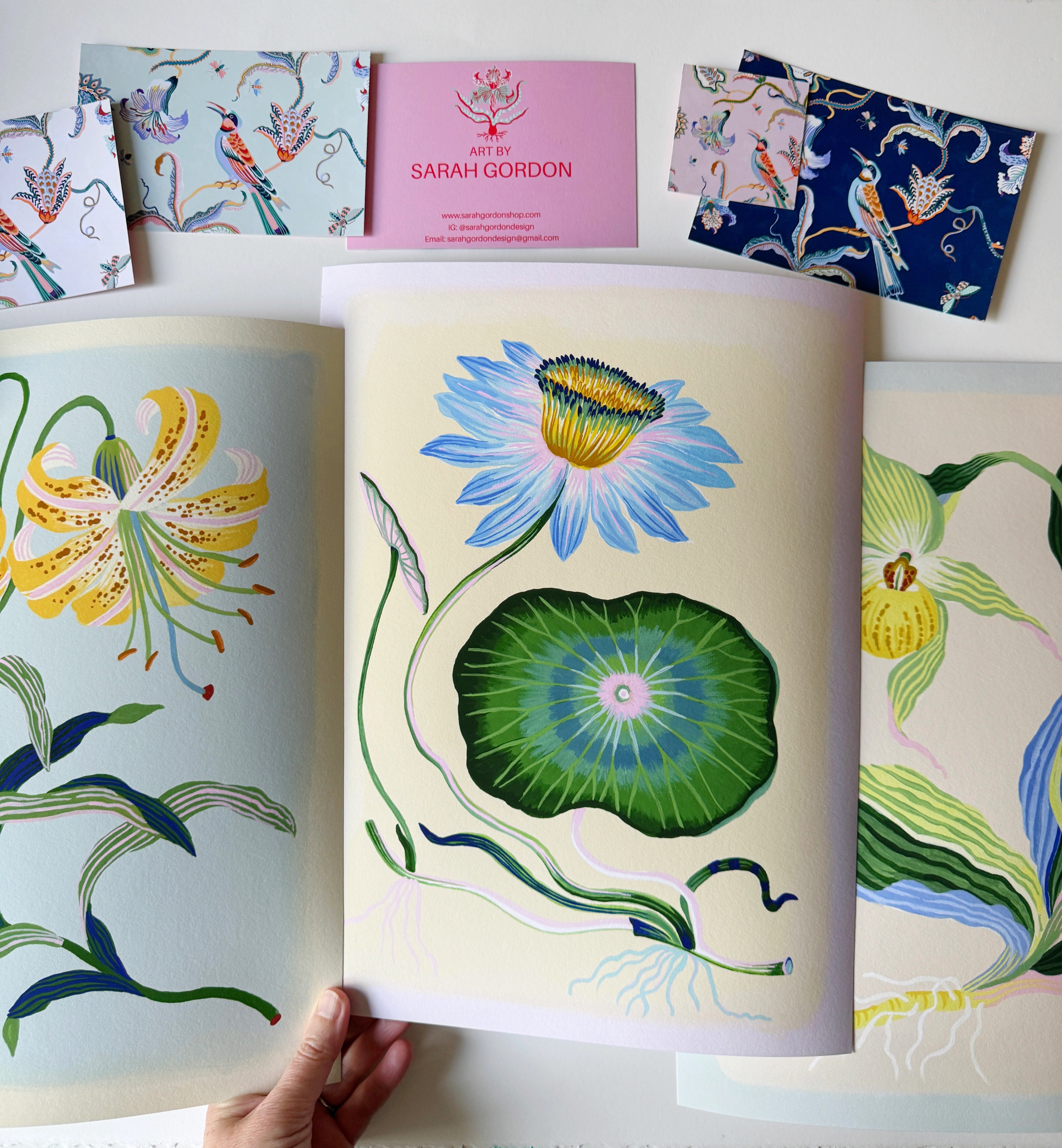 Sarah Gordon is a British artist and textile designer working from her coastal home studio on Bainbridge Island, WA. She is known for her curious, contemporary artwork that brings together botanicals, insects and birds with seaweed, coral and other natural elements. Much of Sarah’s inspiration comes from daily walks at local beaches and forests where she collects natural ‘treasures’ that become the start of new artwork ideas.