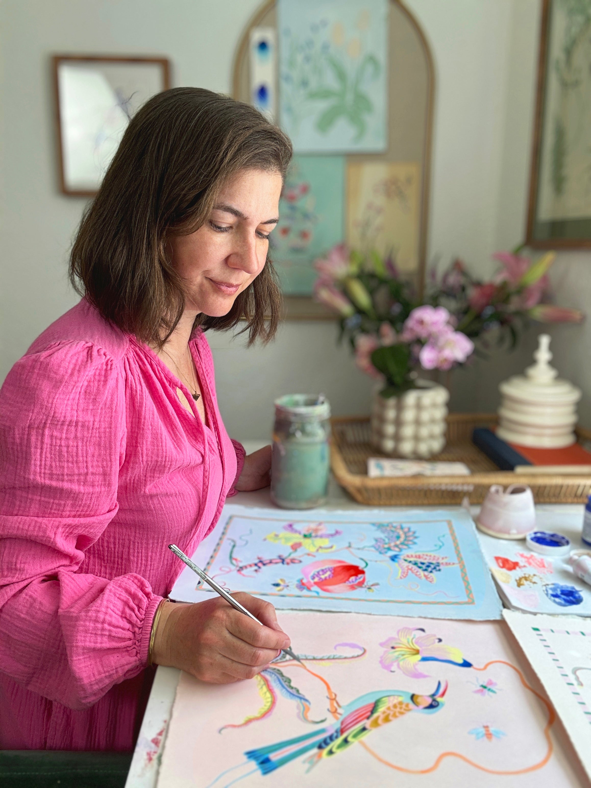 Sarah Gordon is a British artist and textile designer working from her coastal home studio on Bainbridge Island, WA. She is known for her curious, contemporary artwork that brings together botanicals, insects and birds with seaweed, coral and other natural elements.Much of Sarah’s inspiration comes from daily walks at local beaches and forests where she collects natural ‘treasures’ that become the start of new artwork ideas.